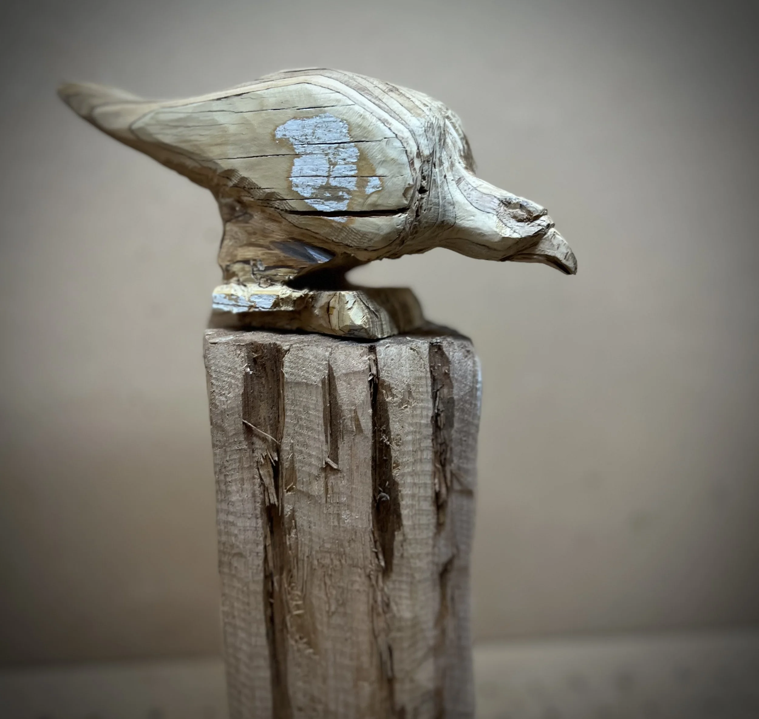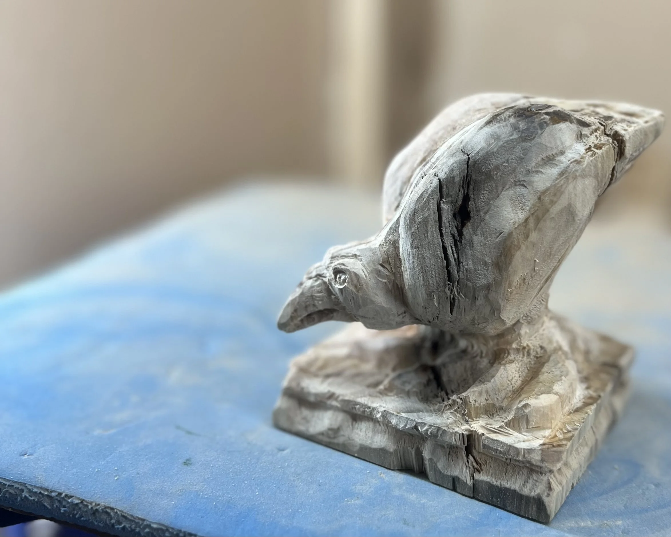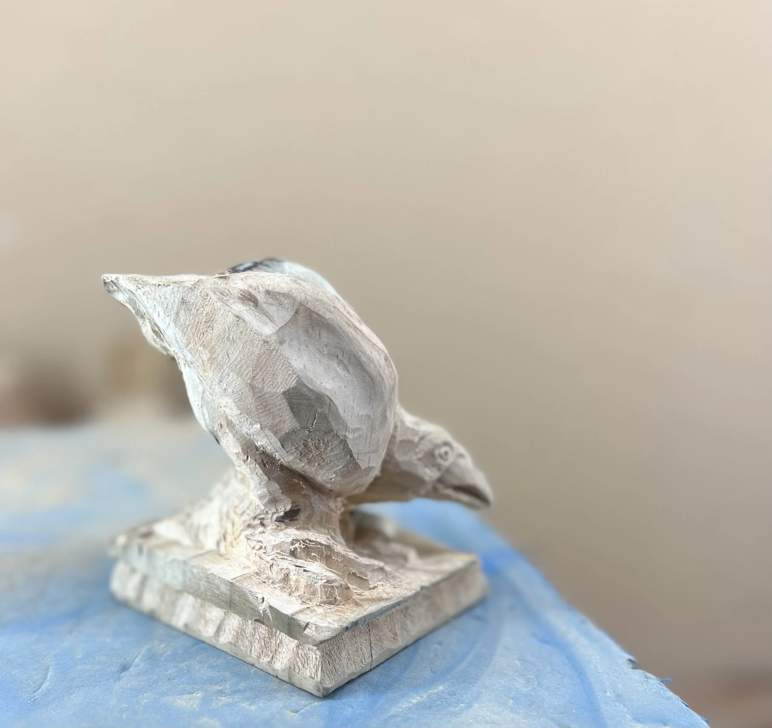 On Sunday, I went back to the studio, and began to work again. The second block, lighter, a bit ‘worn’ and rugged, still with some nails in it that were too rusted to pull, had seen some time. Yet I knew that it too had a story to tell. As the rough cuts fell away, the shape of the magpie emerged. Head down. Beak opening. About to bring itself to ‘voice’ something important…