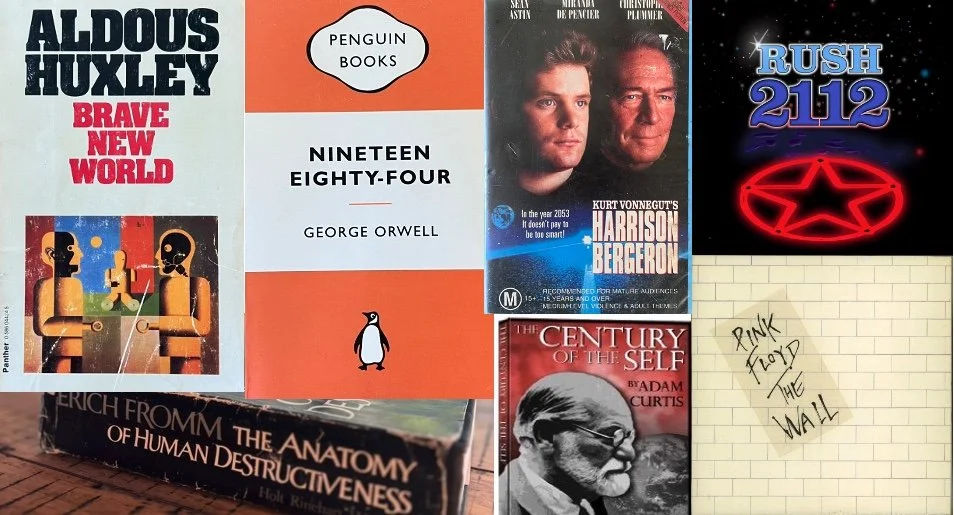 Across Huxley, Orwell, Vonnegut, Rush, and Floyd runs an interesting evolutionary current: and the realisation that restrictions (be they political, cultural, national, or organisational) which impede one’s freedoms… that these restrictions create societies that are oppressive. Yet, and this is important, we can look to see where these restrictions are, even if this means they exist in our own world views, and we can then critically think on whether they help or hinder our ability to meet our purpose and thus thrive.